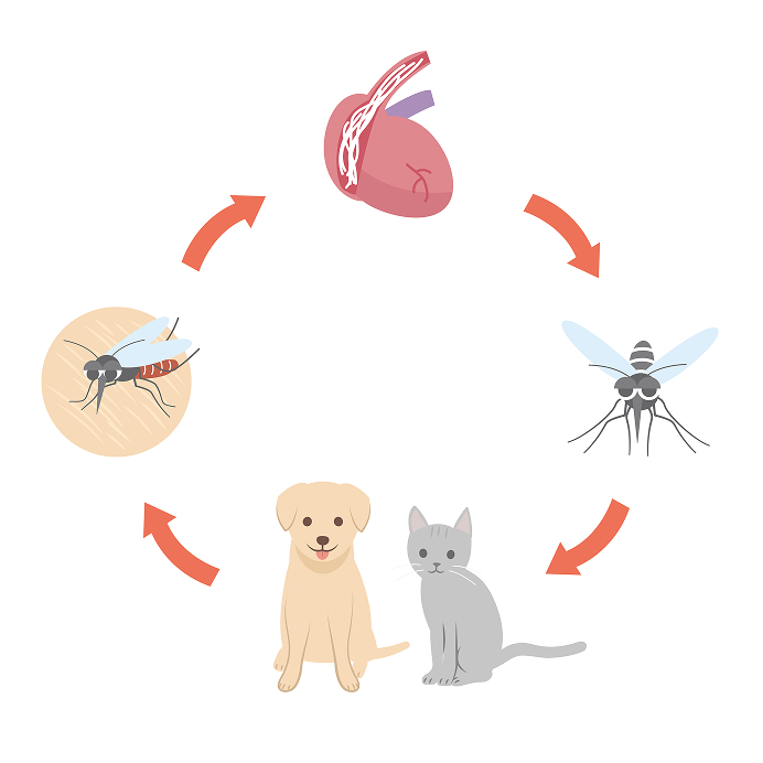 フィラリア症は、蚊を介して感染する寄生虫の病気です。体内に侵入したフィラリアは心臓や肺の血管に寄生し、時間をかけて増殖していきます。初期には目立った症状が出ないことも多く、気づかないうちに病気が進行してしまうことがあります。進行すると、咳や呼吸が苦しそうになる、元気や食欲がなくなるなどの症状が現れ、重症化すると命に関わることもあります。