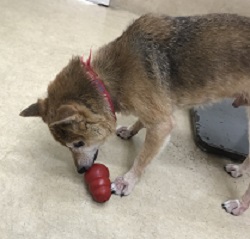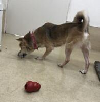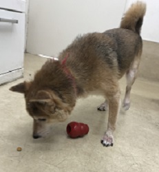 ケンちゃんコングの中にあるおやつを取るのに夢中・・・上手に取れるかなー(^^??