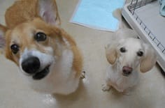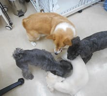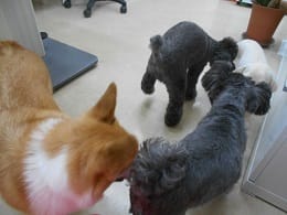 左からトイプードルのリュウちゃん、ウェルシュコーギーのラウルちゃん、ミニチュアダックスのグティちゃんです(^o^)